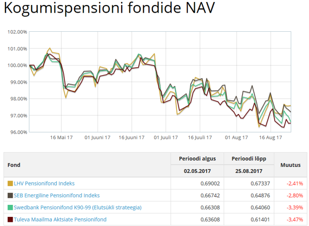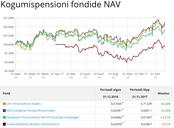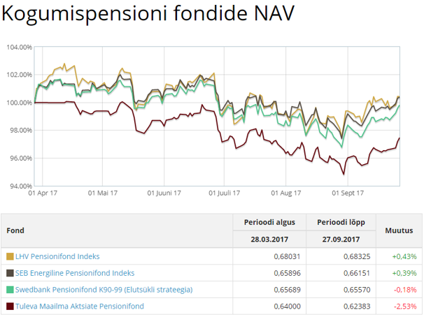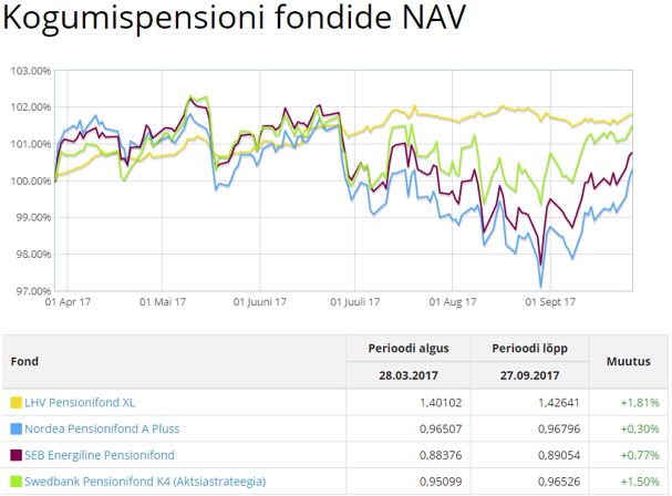 Ja puhtalt võrdluseks siia ka aktiivselt juhitud 75%lise aktsiakategooria pensionifondide viimase 6 kuu tulemused samal perioodil 28.03.17-27.09.17. Selle 6 kuu tulemused jäävad vahemikku +0,30% kuni +1,81%.