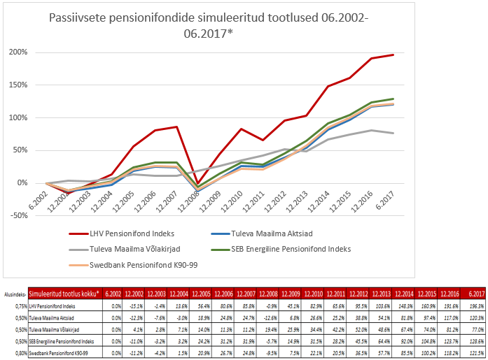 Kuna olen ka korra varasemalt passiivsete pensionifondide ajaloolist simulatsiooni siia postitanud 06.2002-12.2016 perioodi kohta, siis nüüd on aeg uuenduseks perioodil 06.2002-06.2017. Seda enam, et vahepeal on muutunud SEB indeksfondi poolt võetav tasu ning Swedbanki indeksfondi investeerimispoliitika. Loodan, et sellest on abi indeksfondidega kaasnevate võimaluste ja riskide sisuliseks hindamiseks.