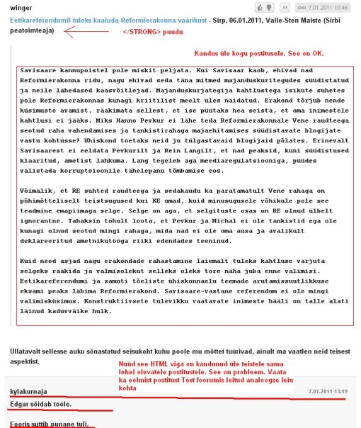 14) Suurem probleem postituse parsimises ja foorumi visuaali vormistamises: Kui tehakse viga HTML koodis - ei tea kas käsitsi BBCode sisestades ja viga tehes probleem on olemas - siis foorumi üldine kujundus läheb samuti nihkesse. Vaata minu postitust test foorumis test foorumi postitus