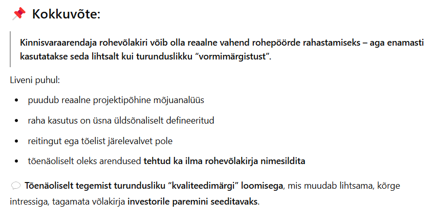 Varasemate laenude tähtaegade pikendamise üle läbirääkimine või laenude refinantseerimine on vajaduspõhiselt äriplaani ja -tegevuse tavapärane osa. Viimased refinantseerimised toimusid edukalt veel hiljuti, 2024. aasta alguses, nagu ka prospektis ja viimases auditeeritud majandusaasta aruandes kirjeldatud. Ehk saan kinnitada, et püstitatud hüpotees ei leia kinnitust ning ei ole võlakirjade emiteerimise põhjus ja eesmärk.