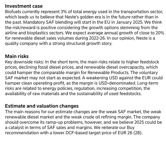 Lõpuks sai ka Q3 analüütikute küssadega loetud. SAF vaba tahtliku kasutamist pärsib tõsiasi,et see kütus on 2.6 korda kallim tavalisest lennuki kütusest. 2025 tuleb Euroopas nõue, et 2% kogu mahust peab SAF olema, ennem miskit ka ei muutu palju. Kiiret tõusu siin näha ei ole, aga värske CEO tundub asjalik mees jä kärbib mõtetu investeerimise, b nagu see nõudluseta vesiku valdkond hetkel on. Vesinik paistab üldse paras pain in the ass tegelane, kuna selle keemise temp veel hullem kui LNG oma, et kõik asjad peaks megalt ära soojustama ja LNG terminalid sellepärast ei kära ka vesinikule. Investeerimise mõttes pole pikas nägemuses halb aeg, nagu CEO ütles, tsükline bisness, tankeri teemat jälgides ja põhjalikult analüüsides sai laevandus selgeks- kord laevi palju,hinnad all, siis vararaua ralli keegi ei telli , hinnad üleval ja tellimine lahti. Ehk hetke taastuvas kütuse äris majandused kidatsevad nõudlus väiksem ja tootmine üle ja nagu laevanduses, kõik lõikavad CAPEX kulusid ja mingi hetk saabub tasakaal. Nats ennem seda, osta aktsiat :)