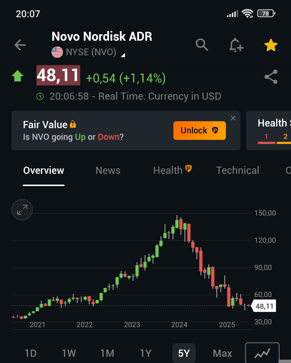 Seekordsel kukkumisel aktsia ju on leidnud ostjad 45-47. Võiks ju oletada, kui me järgneva 2 nädalaga läbi ei kuku võiks päevasel graafikul konsolideeruma hakata vahemikus 50-60. Nädalast graafikut vaadates võiks see mõnda aega seal olla ja põhja kindlustada. Järgmise aasta teine pool, siis on ilusa ilma korral ka nädalasel meeleolu muutunud. Viimane kukkumine oli ju rohkem see, et Novo lõppeks avastas haiguse, mida tõesti Ozempicuga ravida ei saa.