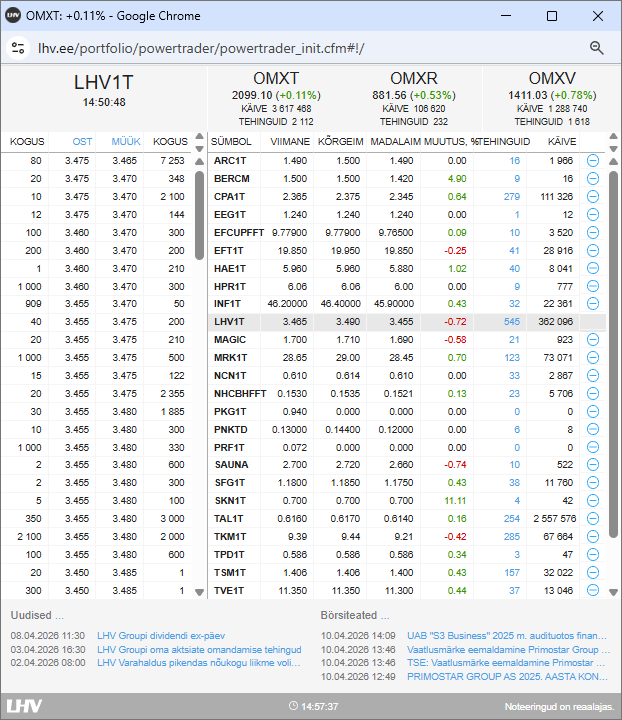 Edit: jälgisin mõnda tehingut - tehingu toimumisel ilmus Powertraderi vasakule üles aktsia nimetuse alla korrektne viimase tehingu kellaaeg, aga paremas tulbas summeerus tehing 5-13 minutilise viitega.