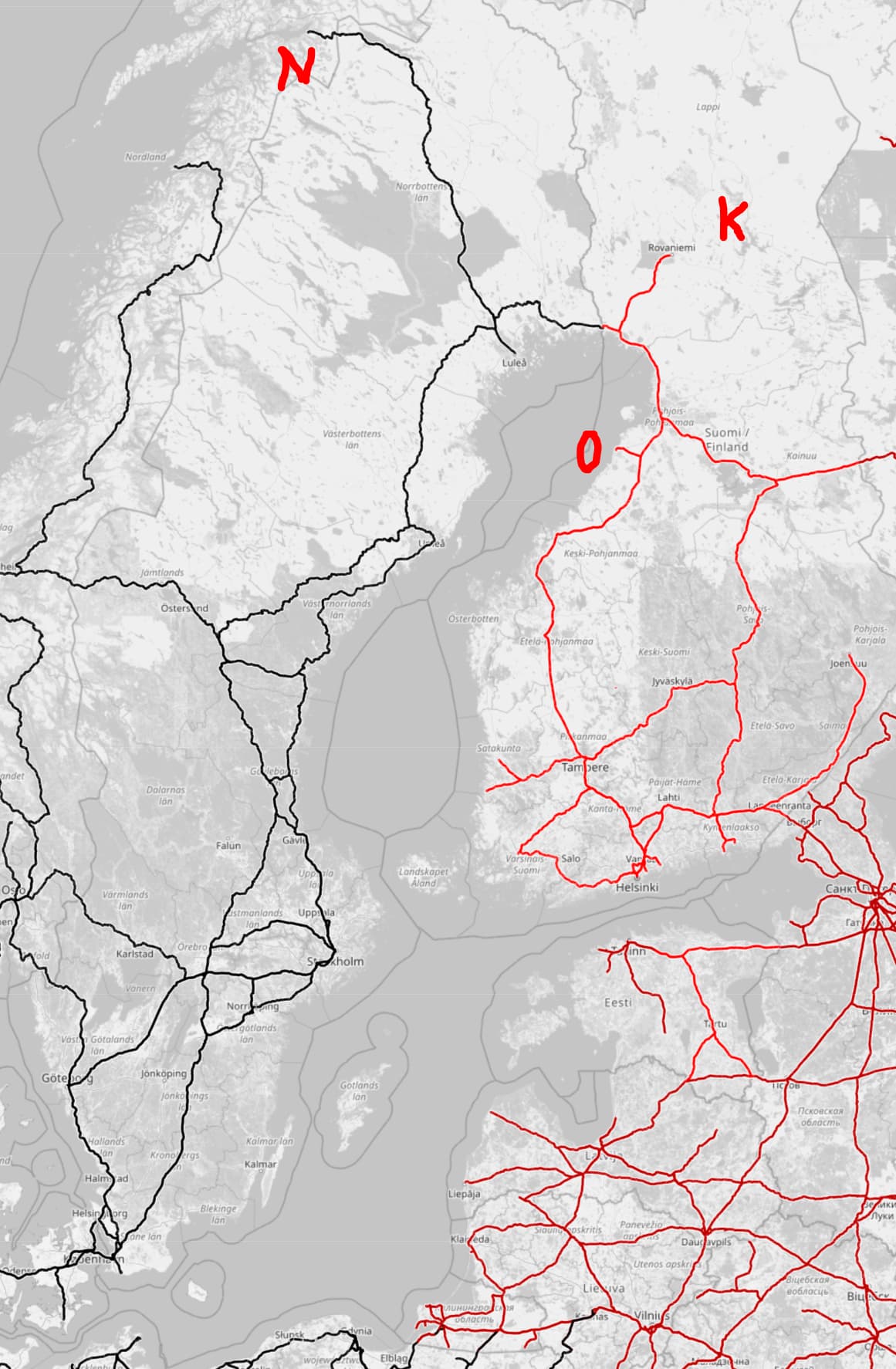Põhja-Soome raudteearendus on ühendamaks Rovaniemi, Kiruna (K), Oulu linnastu (O) jm kaevandus-tööstuspiirkonnad esiteks Narviku (N) sadamaga ning teiseks otseühendusega Euroopaga läbi Haparanda. Hetkel toimub seal mõlemal pool piiri konteinerite ümberlaadimine, mis piirab transporditava kauba sortimenti.