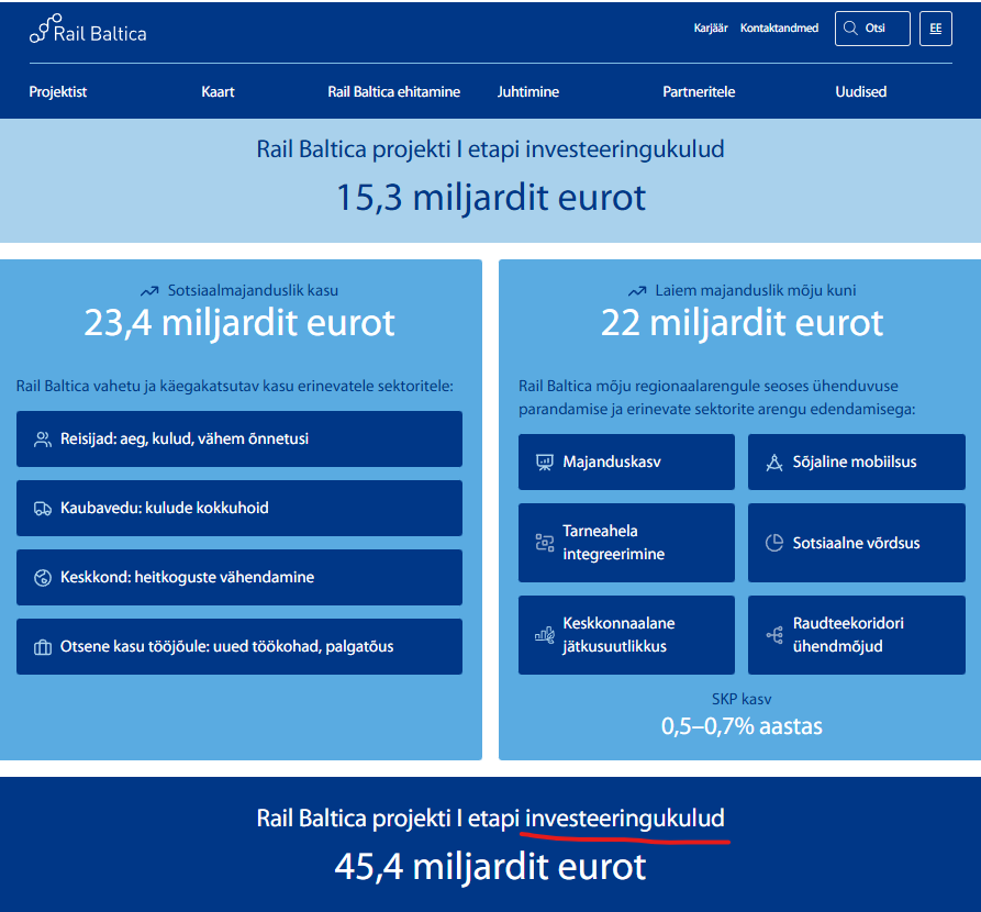 Aga palun - otse RB lehelt “Rail Baltica teeb investeeringu kuhjaga tasa: investeeritud 15,3 miljardist saadav kasu ulatub 45,4 miljardi euroni, tõestades nutikate taristuinvesteeringute väärtust.” 45 fkng jardi!!! ja kõik peamiselt tänu “uugametsade” vahele ehitatud peatustest