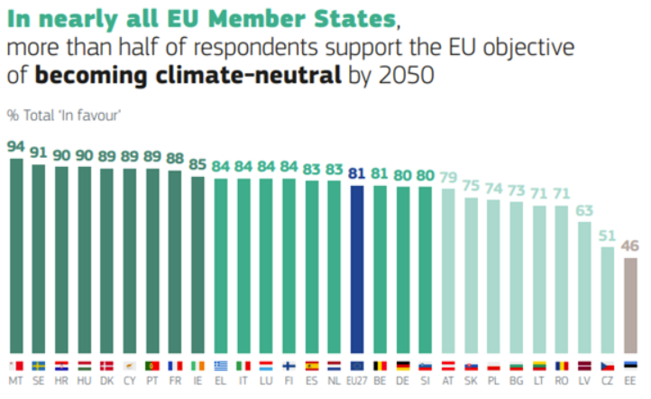 Eestis on keskkonnaküsimused saanud tugevalt politiseeritud konteksti. EL 2050 a kliimaneutraalsuse eesmärke peetakse võimuloleva koalitsiooni agendaks, vaatamata sellele, et nende heaks kiitmine ja kinnitamine Eesti poolt toimus 2019 aasta lõpus, kui võimul oli koalitsioon, kuhu ei kuulunud ühtegi tänase võimukoalitsiooni liiget. Et tänase võimukoalitsiooni populaarsus on madalseisus, peegeldub see ka uuringutulemuses.