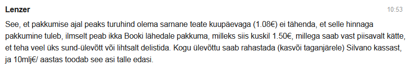 See, et pakkumise ajal peaks turuhind olema sarnane teate kuupäevaga (1.08€) ei tähenda, et selle hinnaga pakkumine tuleb, ilmselt peab ikka Booki lähedale pakkuma, milleks siis kuskil 1.50€, millega saab vast piisavalt kätte, et teha veel üks sund-ülevõtt või lihtsalt delistida. Kogu ülevõttu saab rahastada (kasvõi taganjärele) Silvano kassast, ja 10mlj€/ aastas toodab see asi talle edasi.