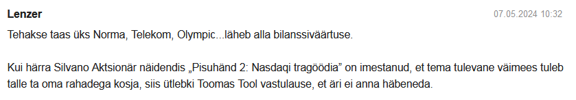Miks? Ei saa sellest negatiivsusest aru. Ettevõttel läheb hästi, raha on kodus, suuromanik on edus kindel ja soovib suurendada osalust jne. Erinevalt Delfinist siis üsna positiivne olukord. Tänaselt hinnatasemelt on upside võimalust küll ja veel.
