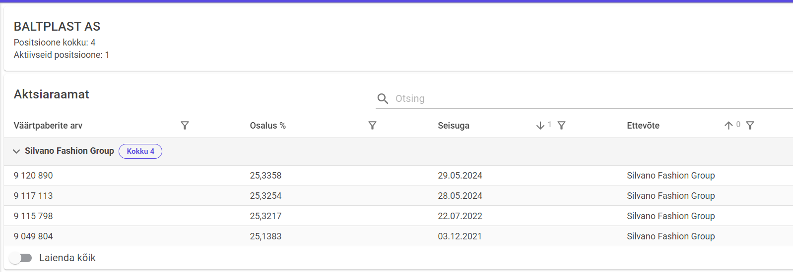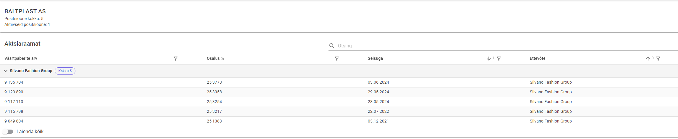 Huvitava asjana tooksin välja, et Baltplast on marginaalselt (+1,400 aktsiat) suurendanud oma positsiooni Silvanos 28.05.2024 seisuga: