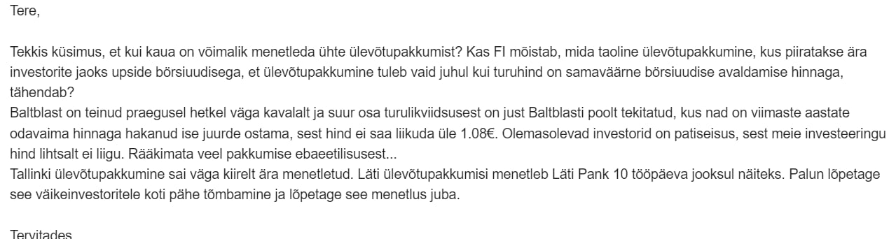Peegeldan natukene veel ka enda frustratsiooni praeguse ülevõtupakkumise ja sellega seonduva aktsia hinnavahemiku lukustamise osas läbi FI-le kirjutatud meili: