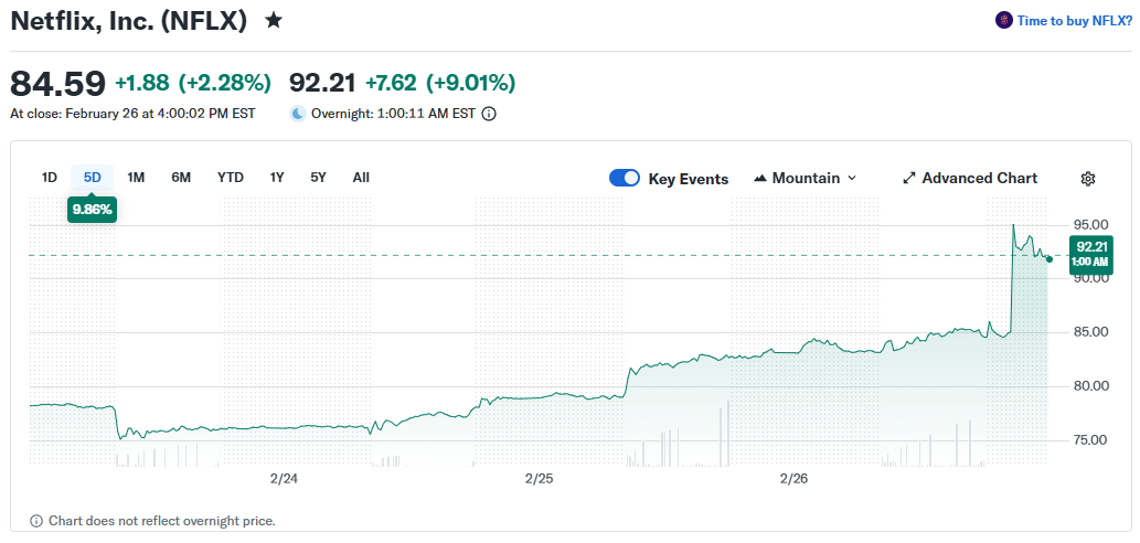 Kuid on kestnud Netflixi ja Paramount kosjaskäik, et omandada Warner Bros. Tundub, et Netflixil viskas üle, droppis mici, tõstis käed üles ja loobus ostusoovist - Selle peale reageeris aktsia järelturul +9%