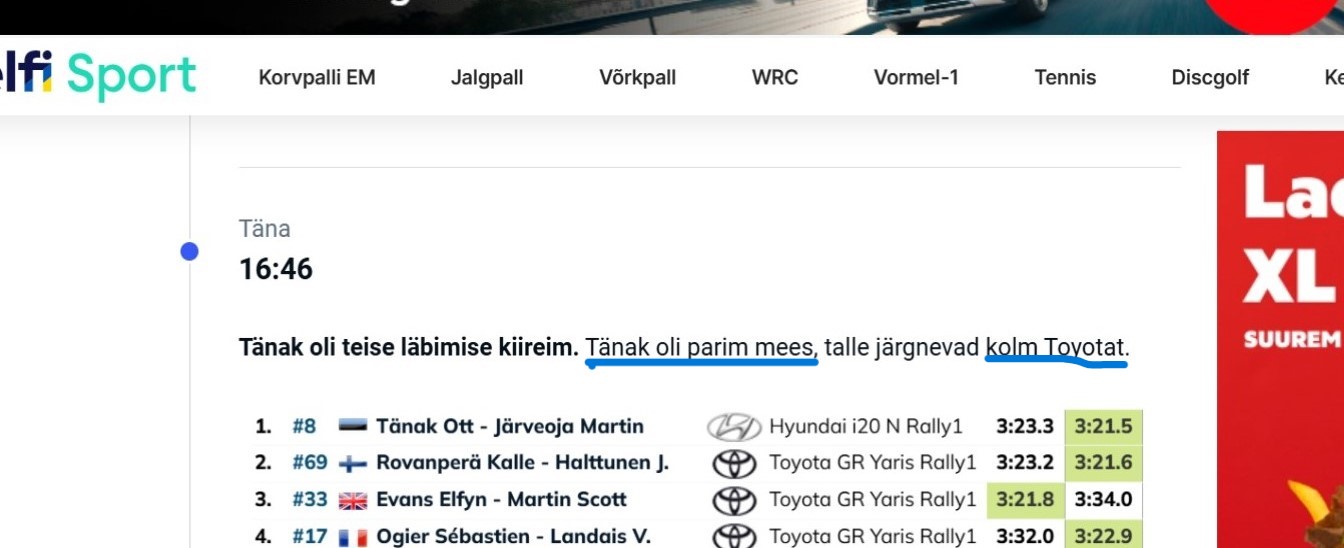 Täna jäi DelfiSport´ist silma lause: Tänak oli parim mees, talle järgnevad kolm Toyotat. Uus sugu on siis lisaks olemasolevatele TOYOTA