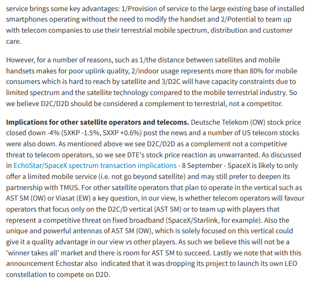 AST kontekstis on üsna vastuoluline olukord - ühelt poolt valideeritakse, et Ligado sageduste väärtus on tasemel või kõrgem, kus seda on eeldatud ehk ca. 8-12B. Lisaks valideeritakse turunõudlust. Teistelt poolt on SpaceX konkurent, kes on tugevdanud oma pakkumuse positsiooni.