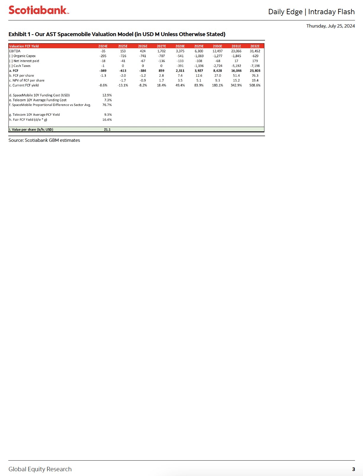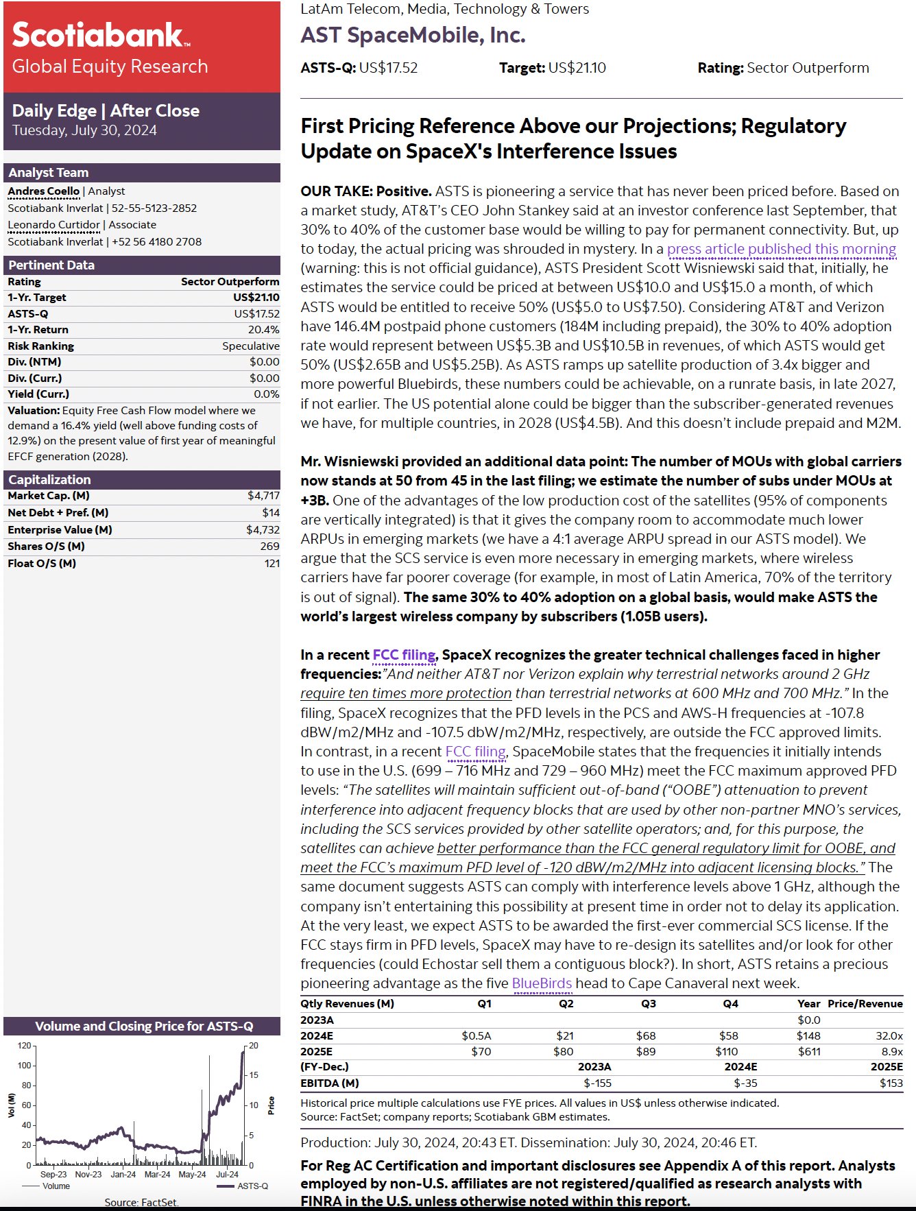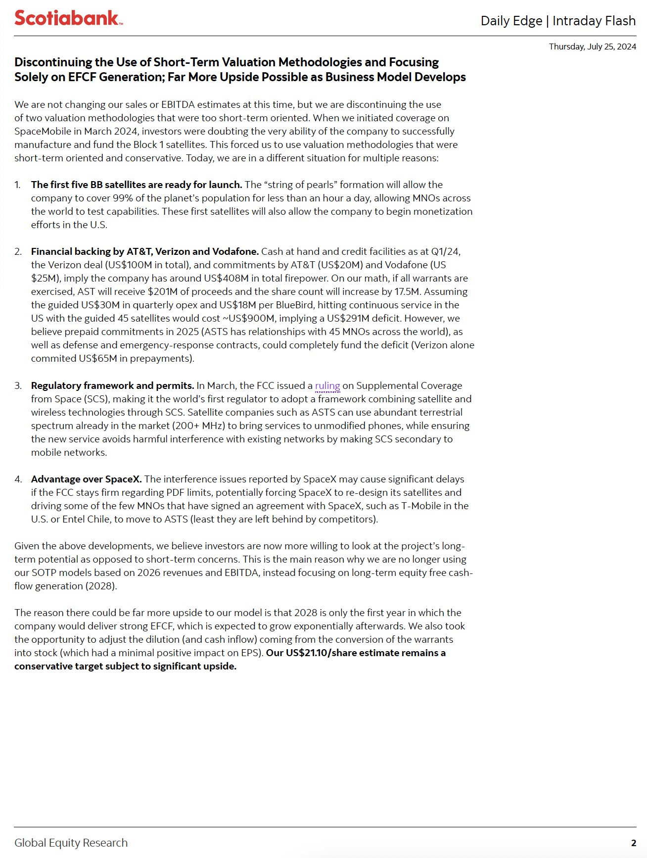 Siin on mitu head mõtet välja toodud, millele tähelepanu pöörata: * Siit edasi keskendub turg peamisel FCF valuatsiooni mudelitele! Scotia on oluliselt konservatiivsem, kui DB. sellele vaatamata näevad käibe/ebitda min kahekordistumist igal aastal 2025-2031. 10B FCF saavutamine Scotia mudeli järgi 2030-2031. * kinnitus väitele, et SpaceX must "re-design its satellites" ja ASTS omab tehnoloogilist eelist. * veendumus, et AST saab esimesena litsentsi kätte. Siin varem küsitule vastus, et nõuete lõdvendamine Starlinki'le on üsna ebatõenäoline, sest reeglid on paigas ja Starlink on üle jala kõike teinud.