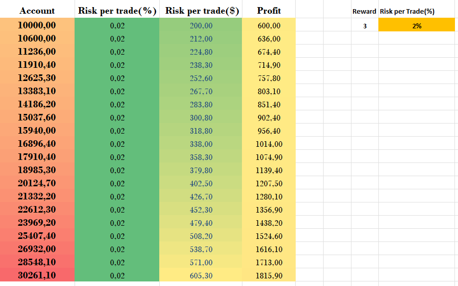 Eesmärk täita seda formi. Alguses õppimisprotsessis muidugi ei õnnestu 20 järjest win teha, nagu tabelis, see ei ole tõenäoline… Kui algaja alustab siis on tal tavaliselt 30 protsenti win rate, õppimisprotsessis tõstab selle 70-80 peale. See on väga tehniline ala. Algaja tavaliselt ei valda tehnikat ja eksib juba seetõttu. Samuti ei näe algaja lõkse sest silm ei ole treenitud märkama. Keskmiselt on päevas neli või viis tehingut, nädala ajaga täidab selle tabeli ära. Kui ei õnnestu või on kahjum siis tagasi algkursuse materjale lugema. See on nagu kõrgem füüsika, kui aru ei saa kõrgemast füüsikast, siis tagasi füüsika 5 klass õpikut lugema.