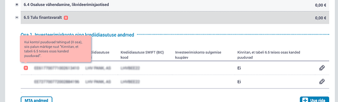 Tere! Kas keegi oskaks aidata. Mul on 2 hüüumärki 6.5 osas teatega: "Kui kontol puuduvad tehingud (II osa), siis palun märkige ruut "Kinnitan, et tabeli 6.5 teises osas kanded puuduvad"."