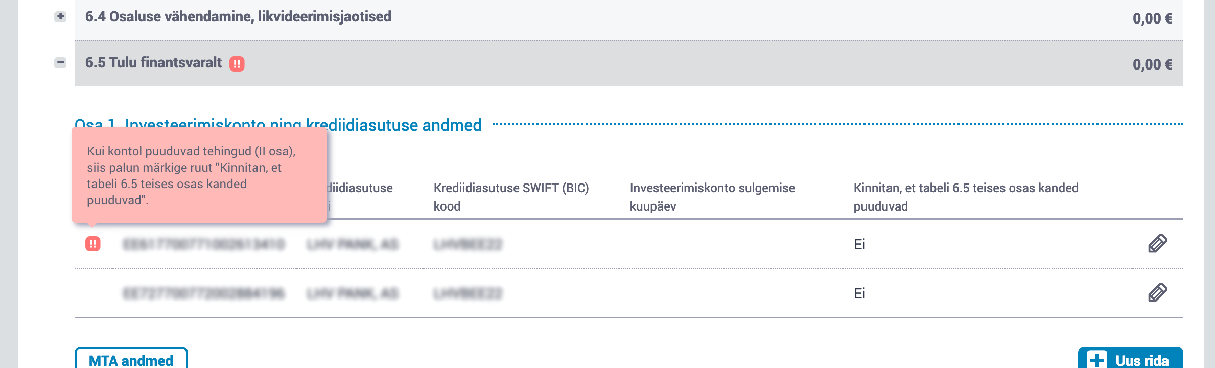 Andmed saatsin juba esimesel päeval ära LHV'st. 6.5 II. osa all "MTA andmed" all tundub kõik olemas olevat. Ma näen ainult nuppu "Asendan andmed". See ei tundu üldse sarnane nupule 'umbes' "Kasuta MTA andmeid". On seal ikka midagi vaja vajutada kui LHV'st andmed saadetud? Ühesõnaga seal "MTA andmed" all on tehingud. Miks mult ikkagi küsitakse, et ma peaksin linnukese panema, et "Kinnitan, et tabeli 6.5 teises osas kanded puuduvad". Kanne on investeerimiskontolt raha välja kandmine?