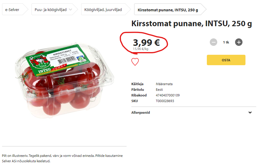 Intsu talu tomati hind on siiski 7.99 (hetkel oli Selveris isegi 5.99) mitte 20. Sellestki ilmselt suur osa on kaupmehe juurdehindlus. Kuu aega tagasi oli Kreeka maasika hind sama, ei olnud kuskil suurt nuttu. Kohalik tomat tundub igal juhul parem ost kui kõrvitsa latte :)