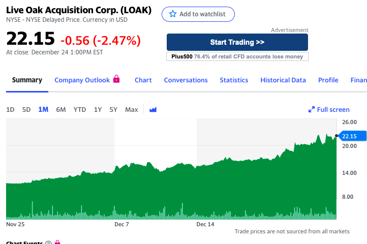 Täna on Live Oak SPAC ja Danimeri mergeri hääletus. Ticker täna veel LOAK. Omajagu üles jooksnud, kuid story on eristuv. Biolagunev plastik. Pakendid, kõrred jms. Tumeroheline teema. Raha sellistele teemadele pressib sisse uksest a aknast. Food, beverage vajab kuvandi parandamiseks rohelist kesta. Danimeril vaikselt lepinguid hiidudega nende pakendite tootmiseks, seega näeks vaikselt mulli tekkimas. Lühiajaliselt on graafik muidugi uue firma tulekule tüüpiliselt üles jooksutatud: