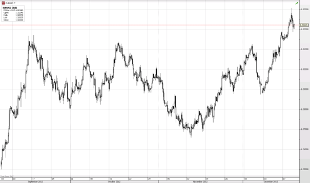 Nii euro kui ka Suurbritannia naelsterling tegid eile USA dollari vastu uued mitme kuude tipud, kuid tulid päeva teises pooles suhteliselt järsult alla tagasi. Euro jõudis $1,3305 tasemeni, kus kaubeldi viimati selle aasta aprillis ja praeguseks hetkeks on EURUSD tulnud tagasi $1,3215 tasemeni. Eile avaldatud Saksamaa IFO ärikliima indeks tõusis eelmise kuu 101,4 pealt 102,4 punktini detsembris, kuid hetkeolukorda hindav indeks langes 108,1 pealt 107,1 punktini. Tulevikku vaatav ootuste indeks tõusis 95,2 pealt 97,9 punktini.