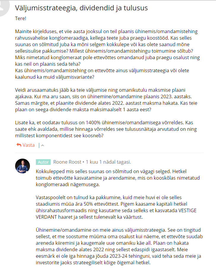 Fundwise-i kampaanialehel esitati küsimus "Mainite kirjelduses, et viie aasta jooksul on teil plaanis ühinemis/omandamistehing rahvusvahelise konglomeraadiga, kellega teete juba praegu koostööd. Kas selles suunas on sõlmitud juba ka mõni selgem kokkulepe või kas olete saanud mõne sellesisulise pakkumise? Millest ühinemis/omandamistehingu toimumine sõltub?"