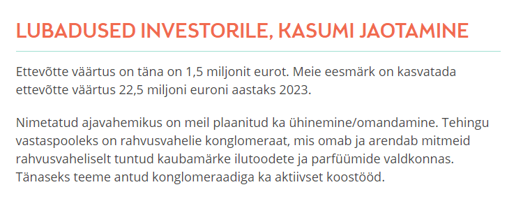 Ma mõistan hästi tervislikku skeptilisust ning "devils advocate'i" ongi tähtis mängida. Samas oleks pisut liig eeldada, et on juba olemas murdmatud lepingud 5a ajahorisondiga 15x valuation exitiks. Kui säärane dokument eksisteeriks siis oleks ju targem laenukapitaliga laieneda investorite kaasamise asemel. Meie oleme omalt poolt viinud investori riski nii madalale kui seda on võimalik teha (tooted on arendatud ja testitud ning auhinnatud, distributsioonivõrgustik (käibe tekkimise allikad) juba olemas ning reaalne exit strateegia ja koostöö selle realiseerumise nimel käimas).