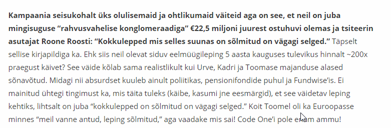 Ma ausalt öeldes ei saagi aru, kas hämad teadlikult või lihtsalt vähesest rahakaasamise kogemusest tulenevalt. See ju see kogu etteheite peamine sisu ongi, et kui midagi konkreetselt kokkulepitut ei ole, siis ei saa väita, et on olemas vägagi selged kokkulepped mingil tasemel M&A tehingu tegemiseks. Veelgi enam, vaevalt, et Oliver Wriedtil on üksi õigus otsustada selliste 20+meuri tehingute üle.
